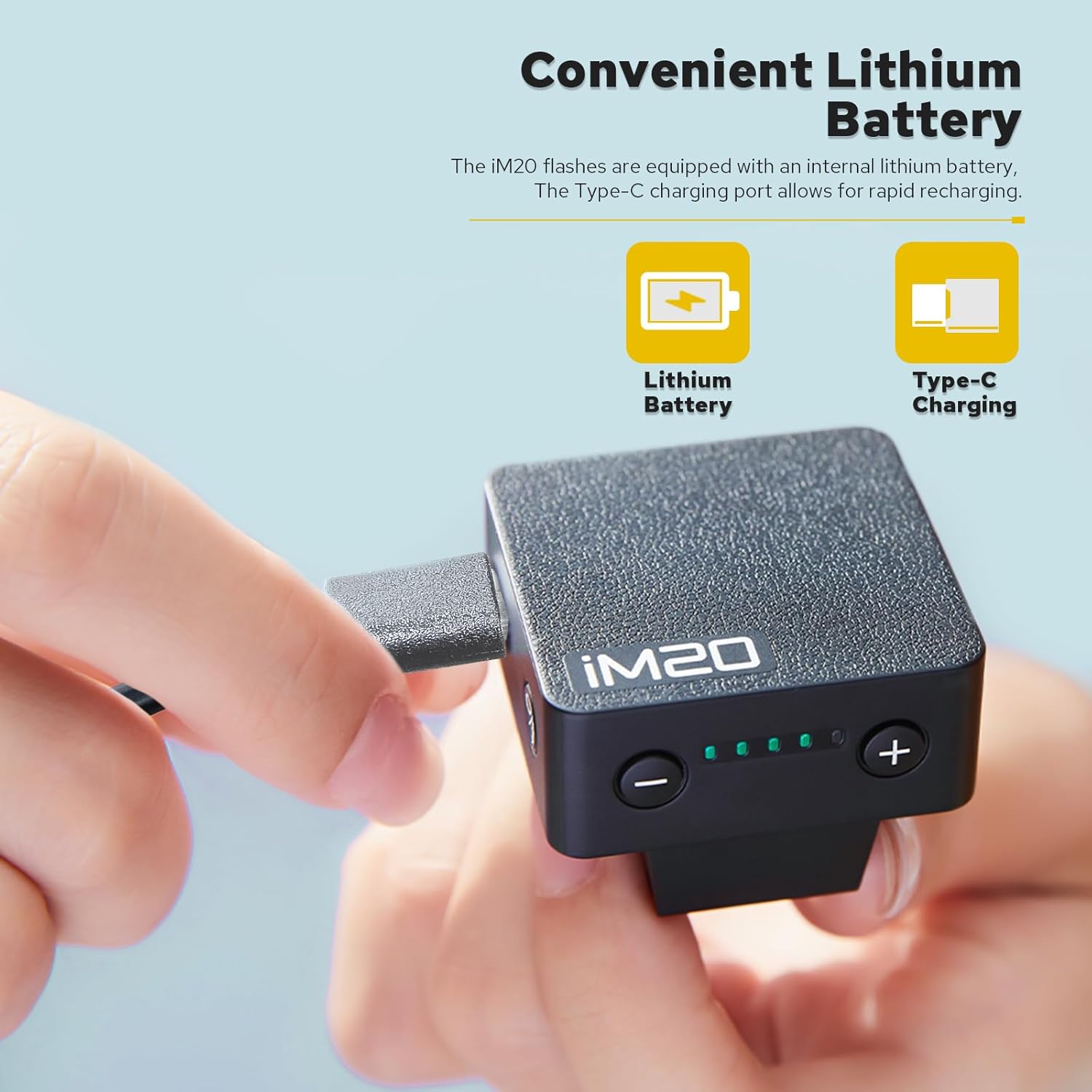 Bateria de lítio de longa duração: Com uma bateria de lítio de 3,8 V/470 mAh integrada, o iM20 oferece desempenho estável e pode disparar até 440 flashes com potência máxima, com um tempo de recarga de cerca de 3 segundos. O iM20 vem com uma porta de carregamento USB C, permitindo recarga rápida e mantendo você preparado para fotografar.