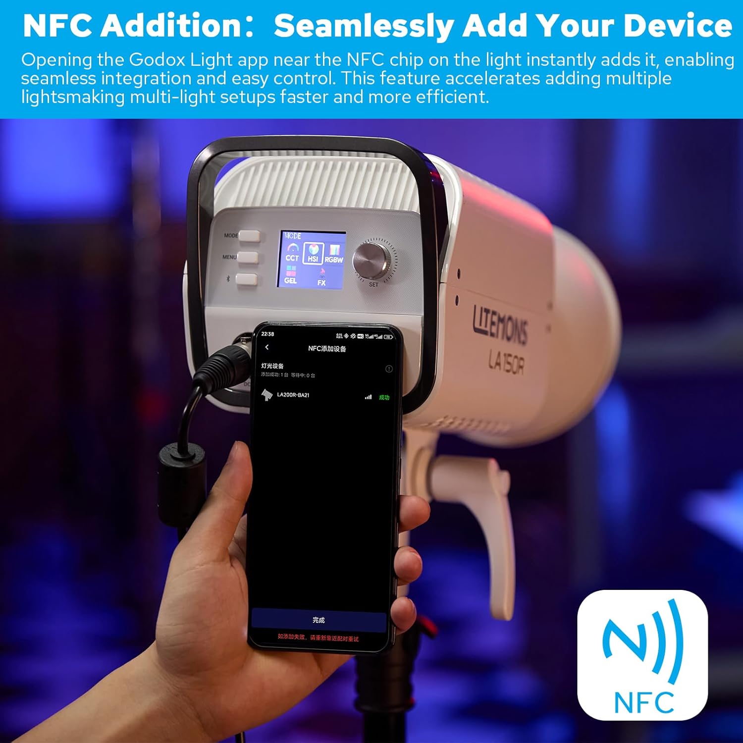- Dicas: O modo RBGW da luz de vídeo RGB Godox LA150R suporta ajustes de brilho personalizáveis para luzes vermelha, verde, azul e branca. Você pode definir e salvar diferentes efeitos de iluminação de cena através do aplicativo "Godox Light", e usá-lo após clicar. Você também pode usar a função NFC do seu celular para parear diretamente com a LA150R, simplesmente aproximando o celular da luz LED.