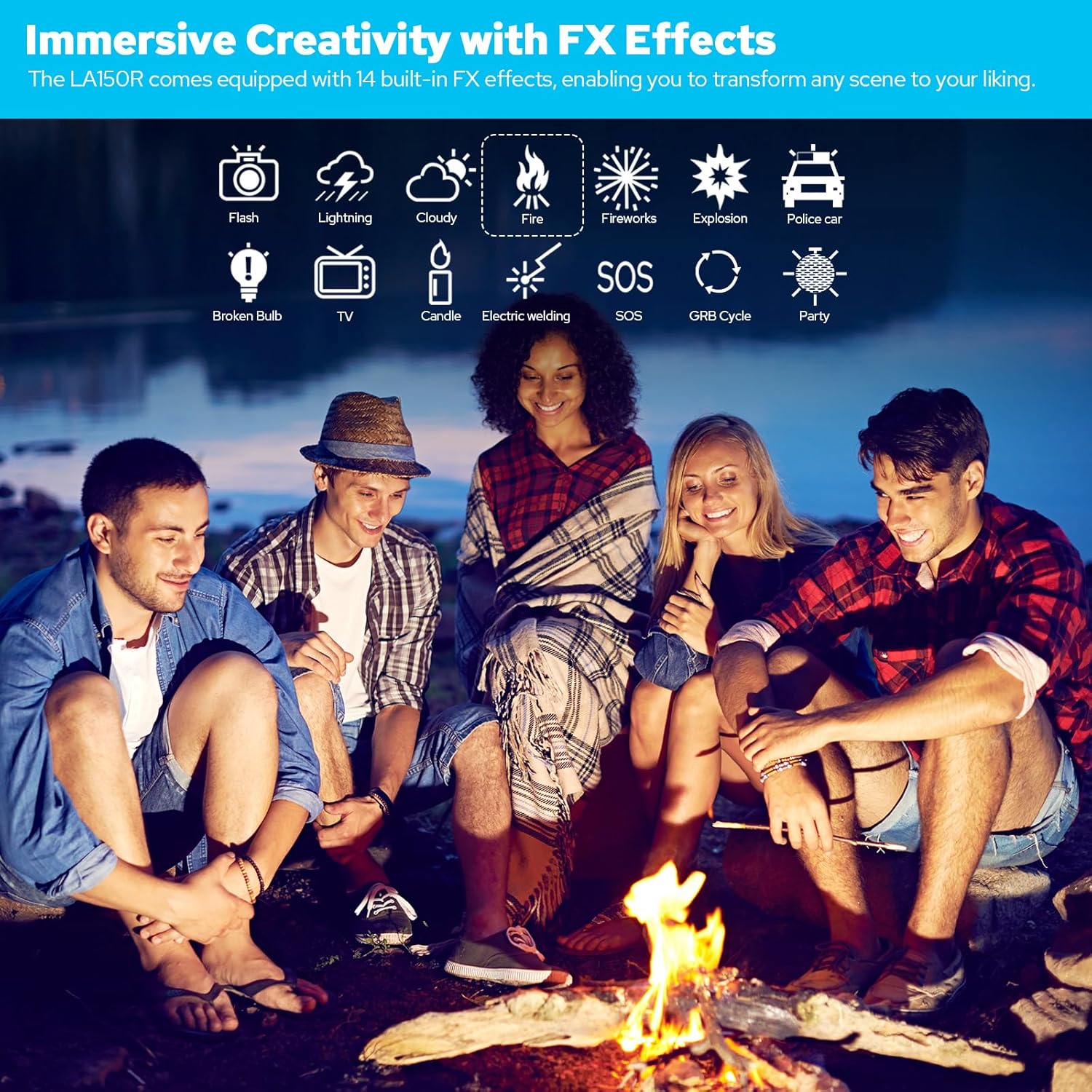 - [14 Efeitos Especiais FX Integrados] - O Litemons LA150R com 14 efeitos FX pode simular os efeitos de iluminação de Flash, Relâmpagos, Nublado, Lâmpada Quebrada, TV, Vela, Fogo, Fogos de Artifício, Soldagem, Carro de Polícia, SOS, Ciclo RGB e Festa. Cada efeito FX permite ajustar a velocidade da luz e o brilho de 0 a 100%, proporcionando mais possibilidades criativas em fotografia e gravação de vídeo.