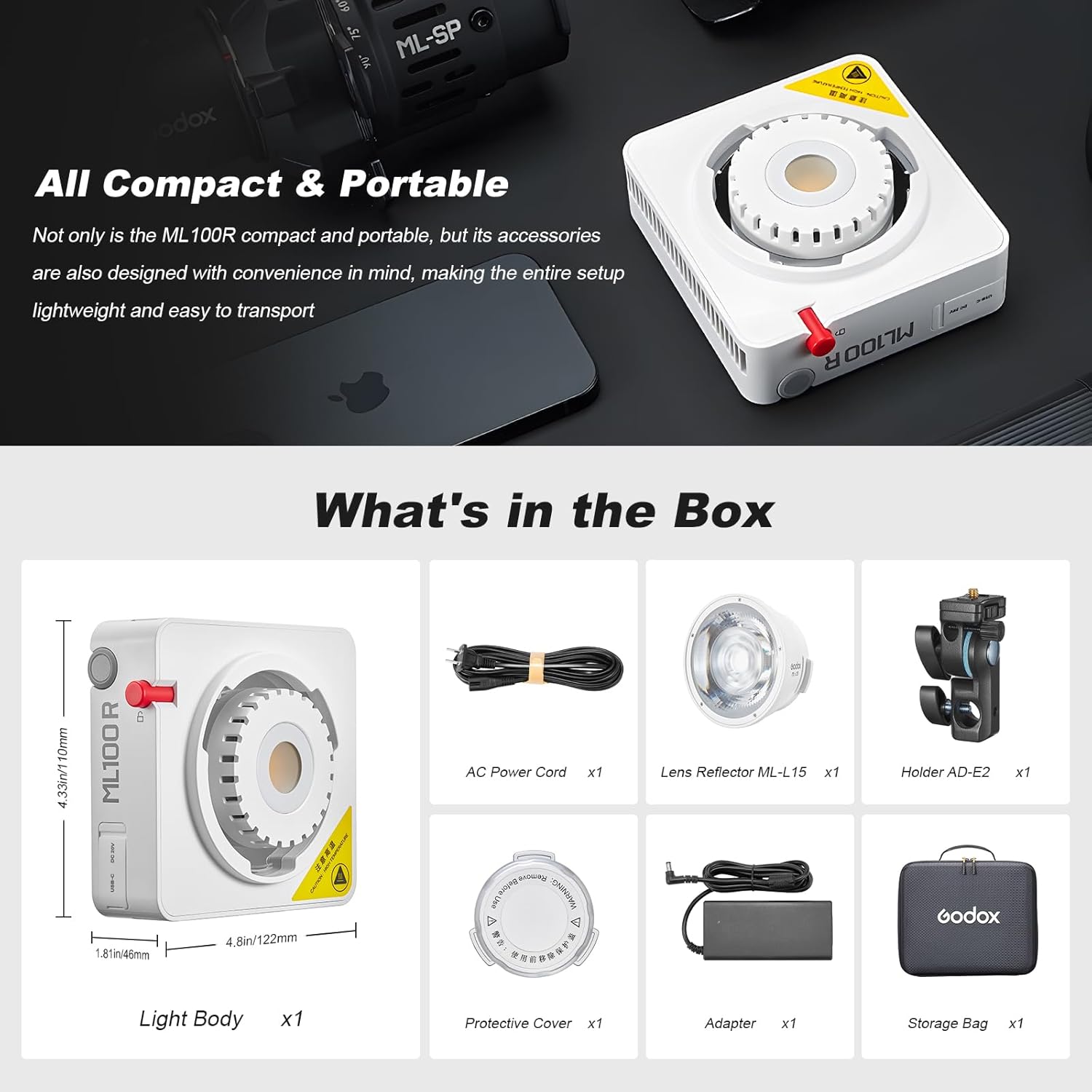 - 🎨 Espectro RGB completo e precisão de cores de nível de estúdio: o Godox ml100r proporciona iluminação vibrante e natural com ajuste HSI/CCT (1800K-10.000K), classificações CRI/TLCI 95+ e capacidade de ajuste GM para correção de cores precisa em qualquer ambiente.