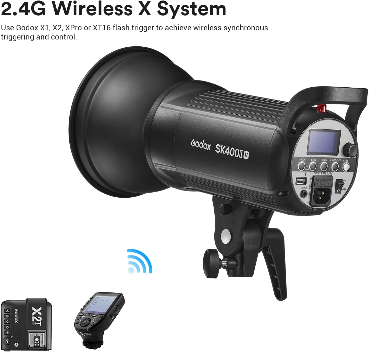 Flash de estúdio Godox SK400II-V, sistema X sem fio 2.4G de 400 W, monolight GN65 5700K com lâmpada LED para modelagem, montagem Bowens, tempo de reciclagem de 0,1 a 1,5 s
