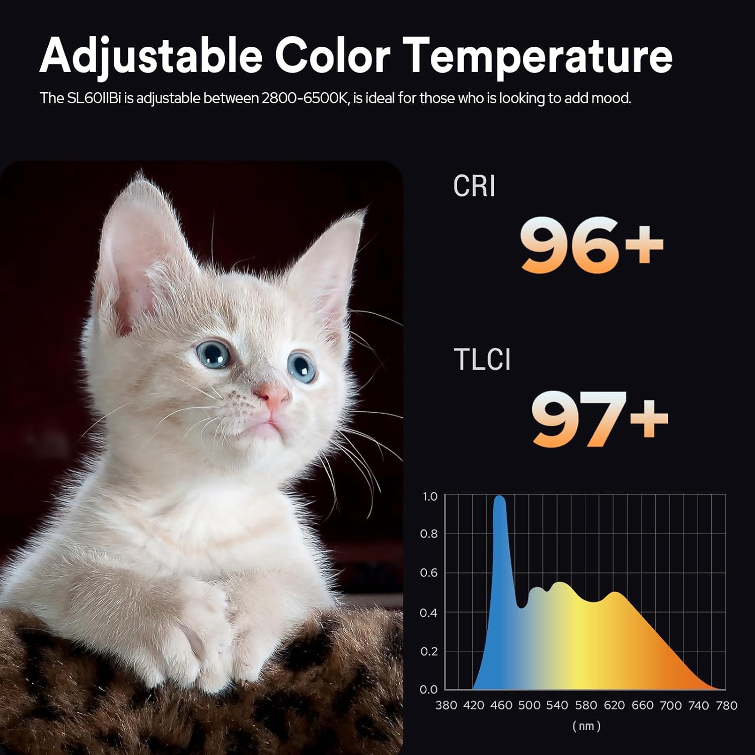 Luz de vídeo LED bicolor Godox SL60IIBi 75 W, 2800 K-6500 K, CRI96+ TLCI97+, 25100 Lux a 1 m, luz de saída contínua LED com montagem Bowens com 11 efeitos FX, controle sem fio APP/2.4G, ajuste de brilho