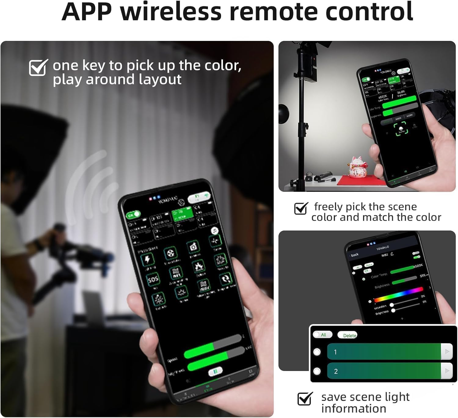 【Potência de saída de 150 W】YN150, potência constante de 150 W, luz de vídeo COB, mudanças de temperatura de cor, a potência permanece inalterada, temperatura de cor de 2700-6500 K, 18000 lúmens a 1 M com refletor padrão, RA≥95, 12 tipos de efeitos especiais de luz.
